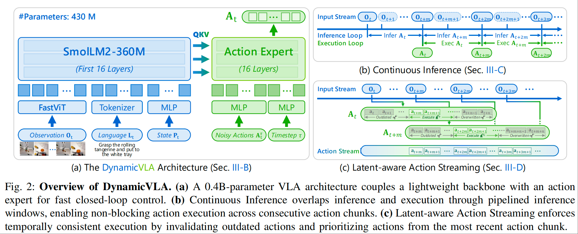 DynamicVLA 采用 “轻量化骨干 + 扩散式动作专家” 的高效架构,在严格控制参数量(仅 0.4B)的同时,保障多模态推理的精准性,为实时动态操纵奠定基础。