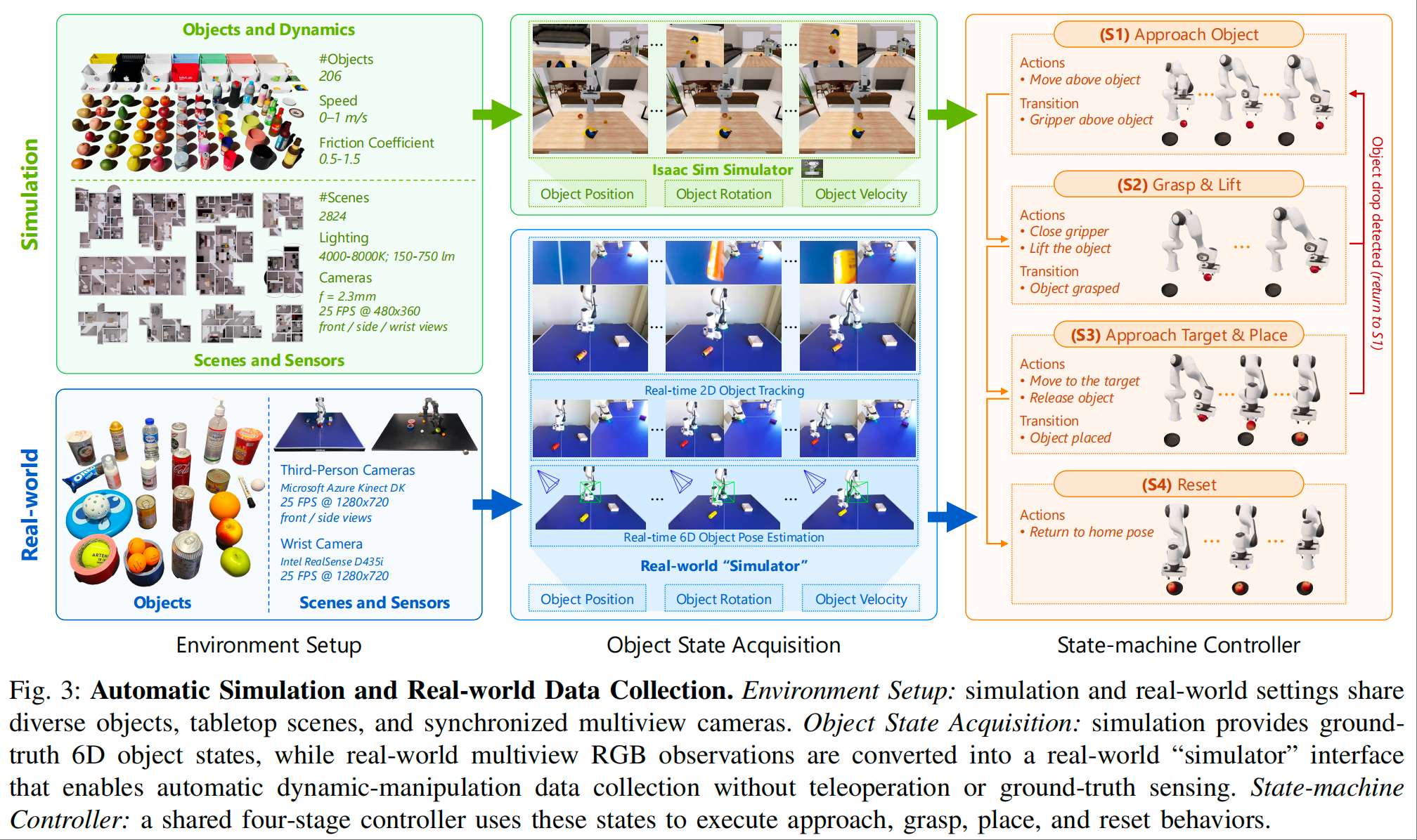 - 双环境采集机制:仿真环境基于 Isaac Sim 搭建,物理引擎提供精确的 6D 物体姿态与速度信息,配合四阶段状态机控制器(接近 - 抓取 - 放置 - 重置)生成标准化的动态操纵轨迹;真实世界环境通过双 RGB 相机(Azure Kinect DK)的几何三角化技术,结合 EfficientTAM 进行目标掩码提取,进而估计物体 6D 状态,还原仿真环境的状态接口,确保数据分布的一致性,降低 sim-to-real 迁移难度。