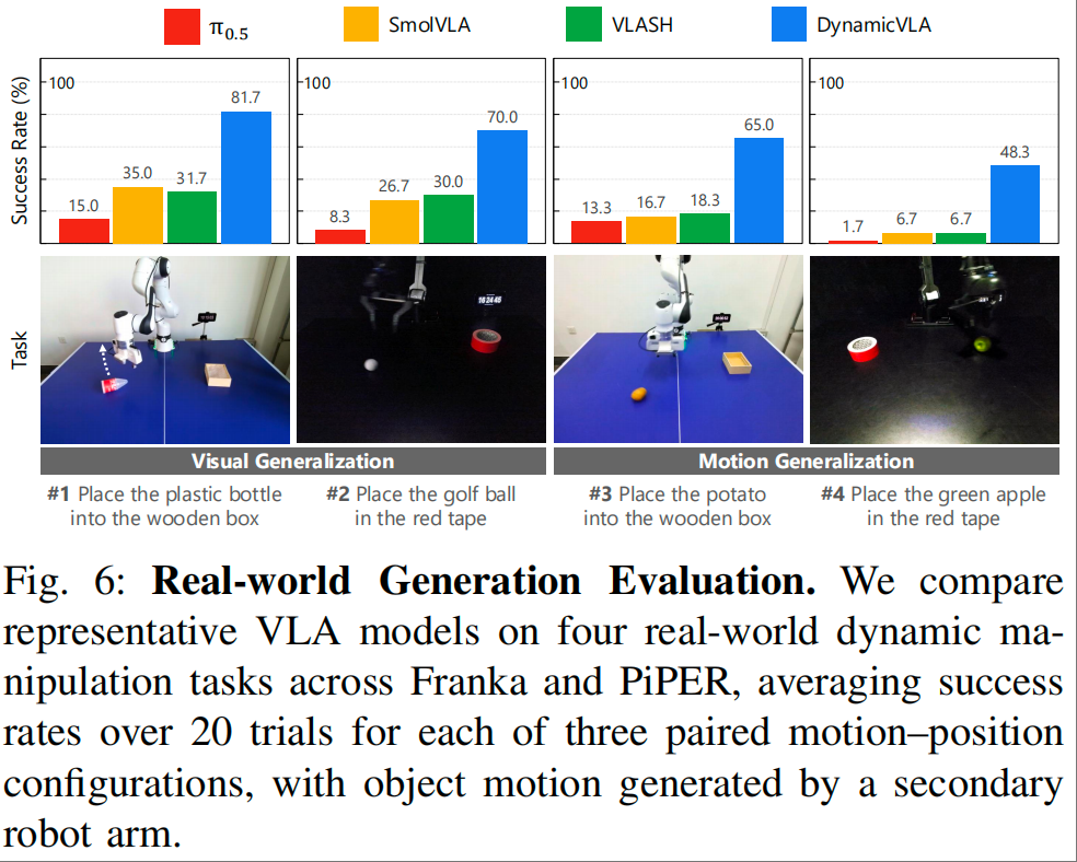 - 泛化能力:在泛化性评估中,DynamicVLA 对未见过的物体外观、运动模式表现出强大的适应能力,视觉泛化与运动泛化成功率分别达 59.5%、65.0%。如图 6 所示的真实世界实验中,即使面对训练数据中未出现的物体形状(如不规则的土豆)、运动轨迹(如曲线滚动的塑料瓶),模型仍能稳定完成操纵任务;而基线模型在分布偏移场景下性能大幅下降,如 VLASH 在 “放置高尔夫球” 任务中的成功率仅 18.3%。不过,在环境扰动测试中,DynamicVLA 的抗干扰性成功率为 26.5%,虽领先基线但仍有提升空间,这是因为仿真中的强扰动场景超出了理想化物理假设,在真实世界中难以精准复现。