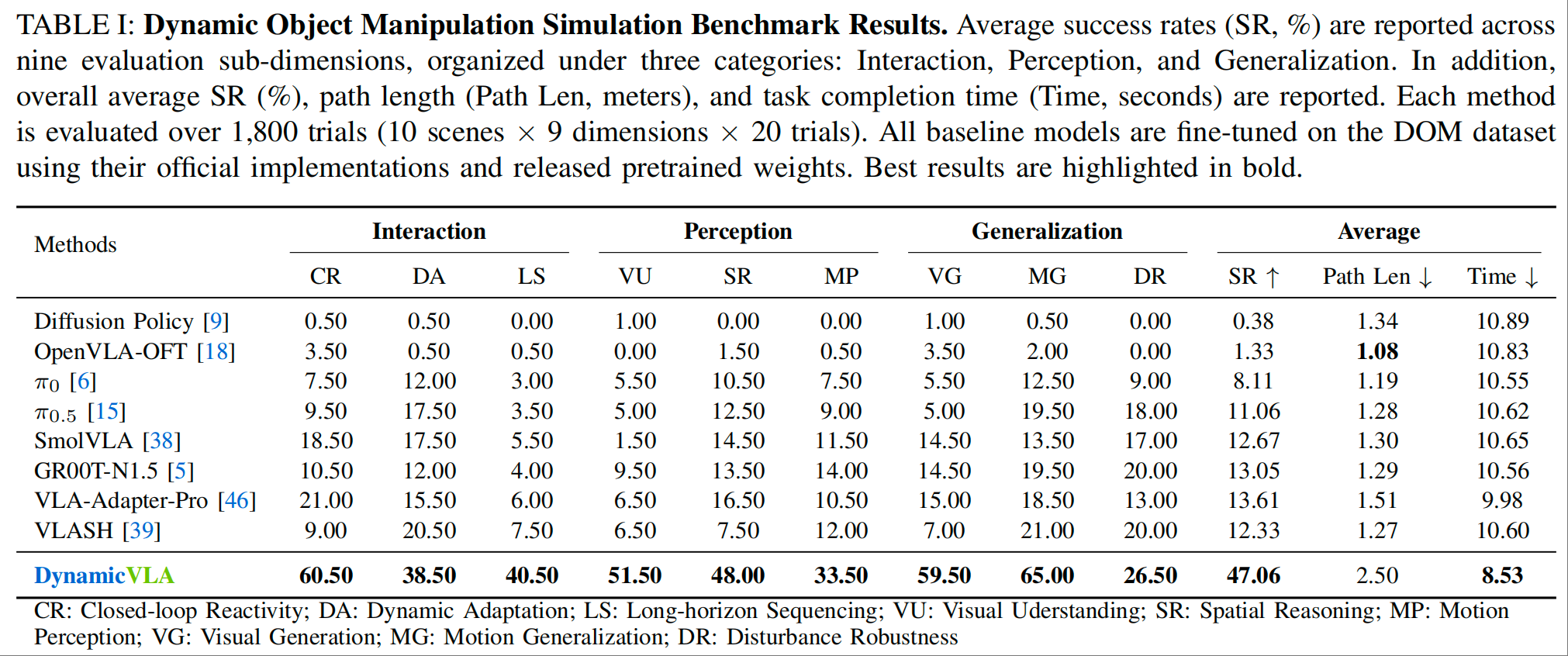DynamicVLA 在 DOM 基准测试与真实世界实验中均展现出显著优势,大幅超越现有主流 VLA 模型,验证了其在动态物体操纵任务中的有效性。