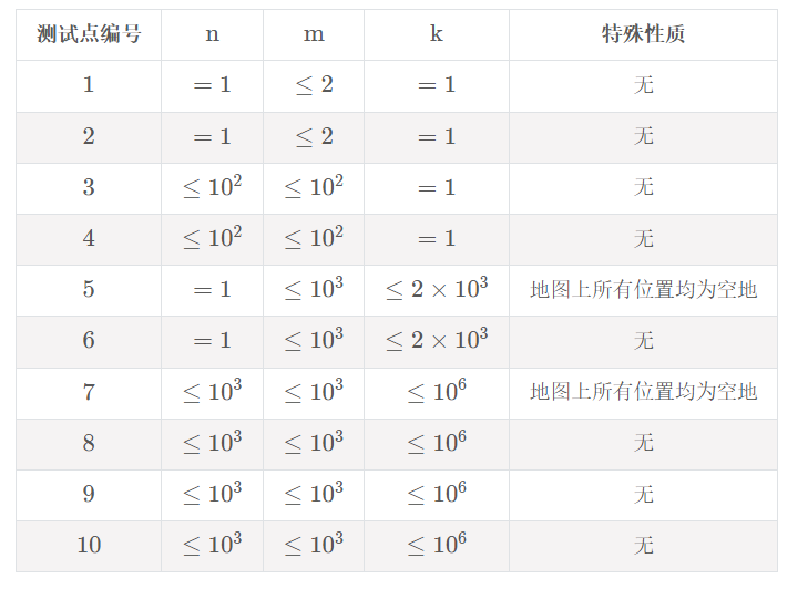 第一行包含三个正整数 n,m,k。其中 n,m 表示地图的行数和列数,k 表示机器人执行操作的次数。