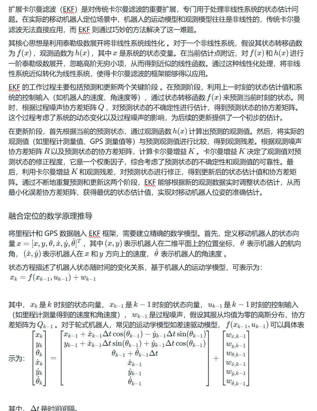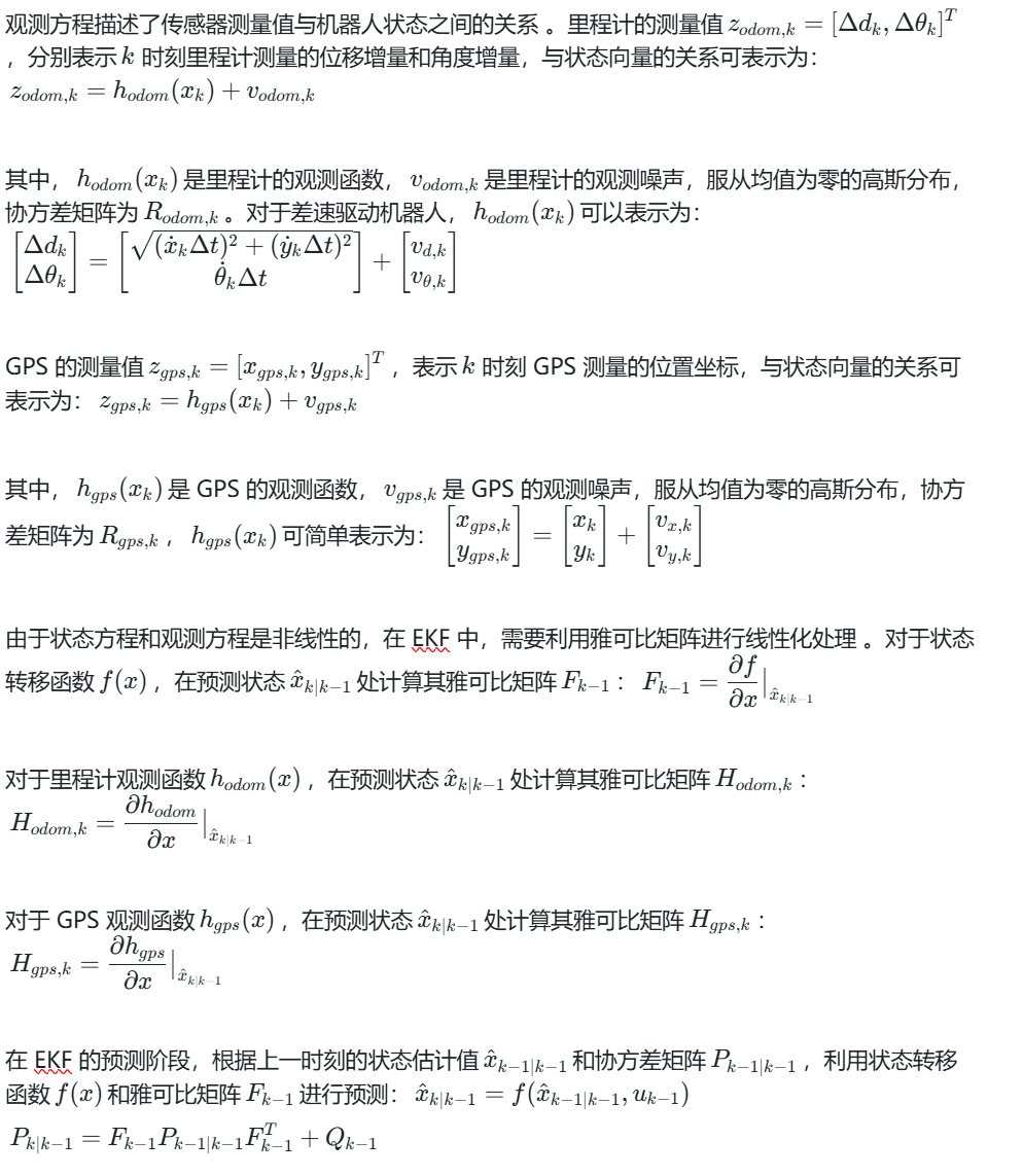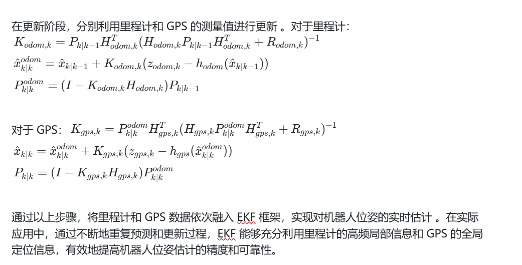 为了解决这些问题,基于扩展卡尔曼滤波融合里程计和 GPS 数据的定位方案应运而生。扩展卡尔曼滤波作为一种强大的状态估计方法,能够有效地处理非线性系统中的噪声和不确定性,通过融合里程计的高频局部信息和 GPS 的全局定位信息,可以充分发挥两者的优势,实现对移动机器人位姿的实时、准确估计。