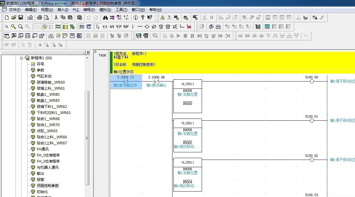欧姆龙, PLC CJ2M标准程序,一共控制12个伺服电机 ,气缸若干,包含轴点动,回零,相对与绝对定位,整个项目的模块都有:主控程序,复位程序,手动,生产计数,只要弄明白这个程序,就可以非常了解整个项目的程序如何去编写,从哪里开始下手,程序流程清晰明了;程序还有与机器人通讯,包含有触摸屏与电路图