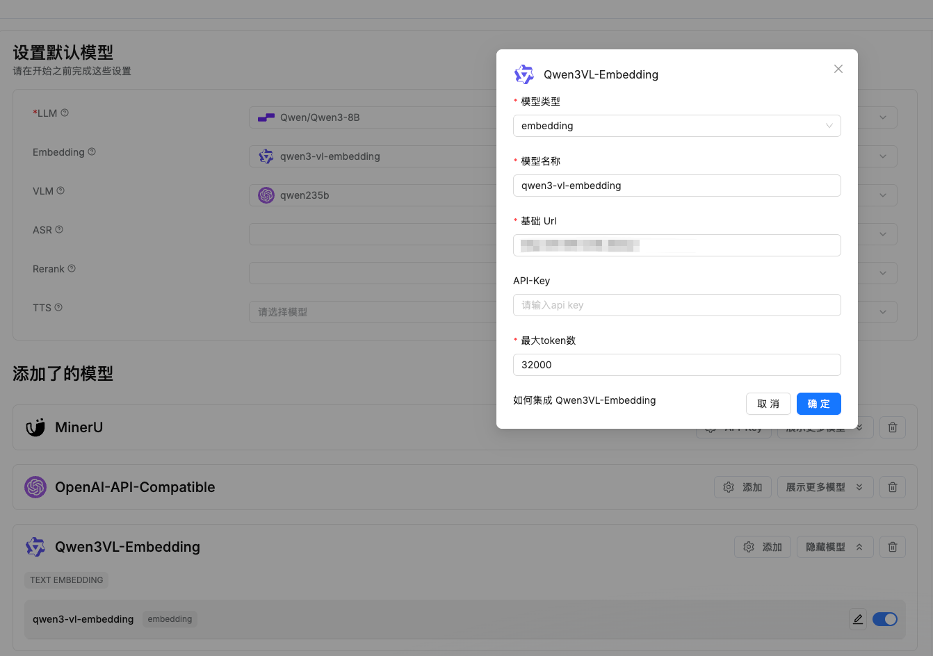 服务启动后,在 KnowFlow 的模型管理页面添加即可使用,完全兼容 OpenAI Embeddings API 格式。