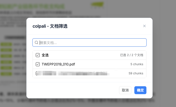 - 问答文档筛选:支持在对话中选择特定文档参与检索