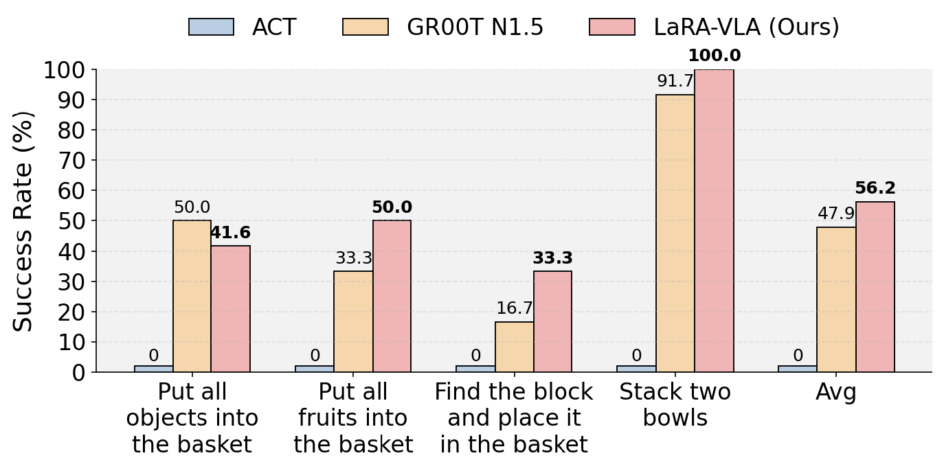 在复杂、长时序的真实机器人操控任务中,LaRA-VLA 的成功率同样显著领先于现有 SOTA 方法。