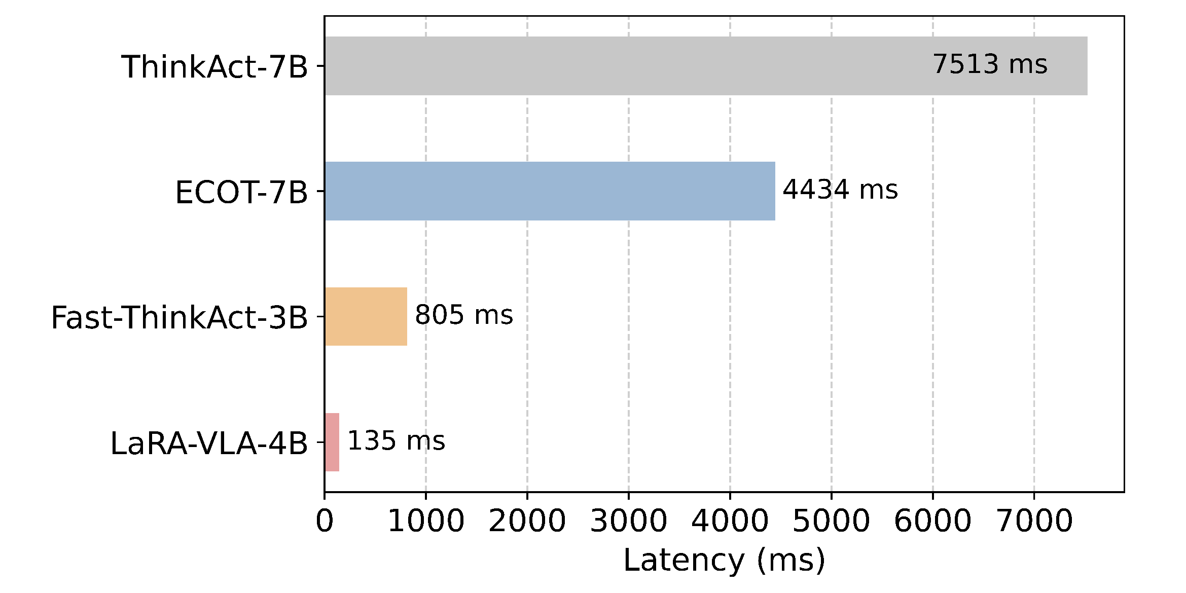 实验结果显示,相比传统的显式 CoT 方法,LaRA-VLA 的推理延迟 降低超过 90%。