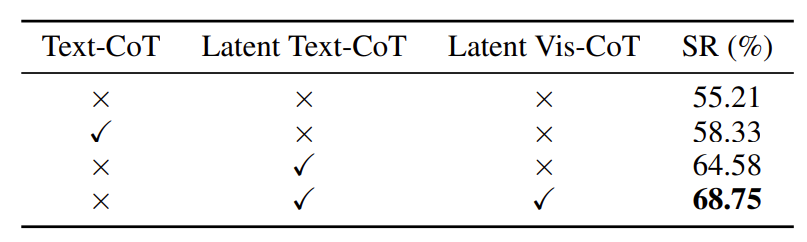 通过显式的文本 CoT 监督,引导模型理解任务逻辑与高层意图;同时,视觉信息始终以连续 latent 的形式参与建模,作为稳定的语义锚点,并提供前瞻性的结构约束。 -