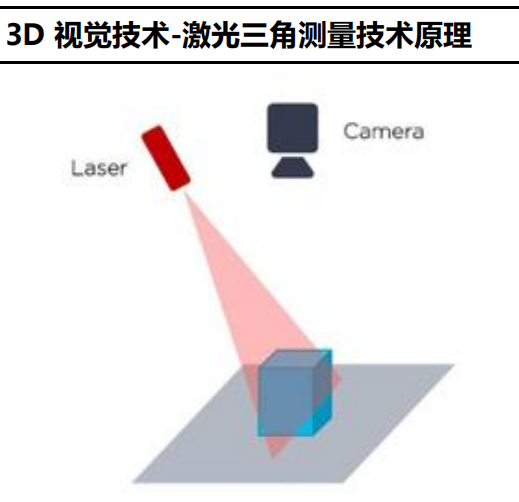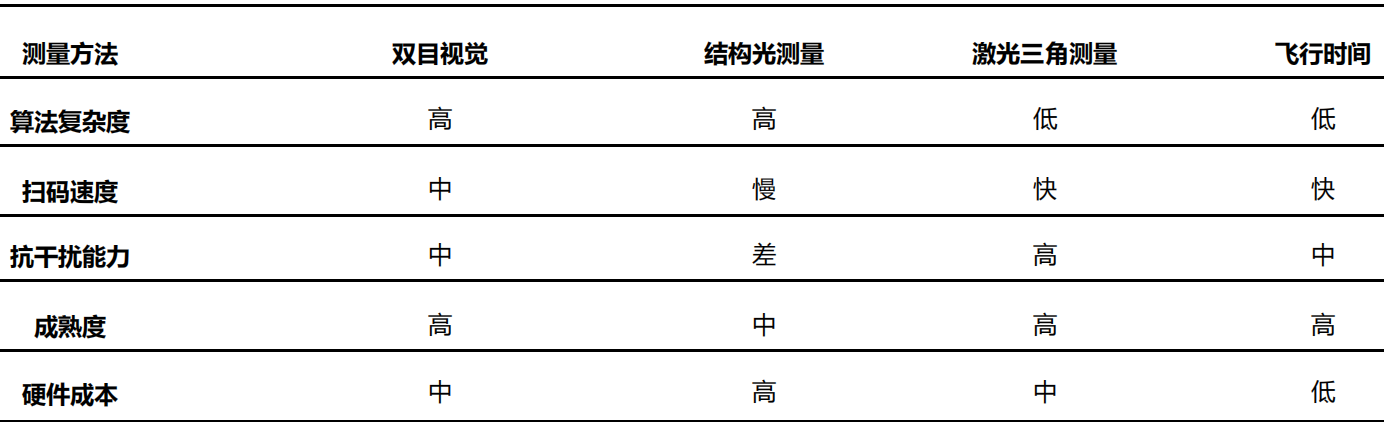 3D 视觉常用四种技术:激光三角测量、结构光、飞行时间(ToF)、多目视觉。工作原理均为红外激光发射器发射出近红外光,经过人脸反射后,红外信息被红 外光CMOS 图像处理器接收,并将信息汇总至图像处理芯片,得到物体的三维数据,实现空间定位。不同之处在于:发射近红外光取得三维数据的方式,激光三角测量用激光线扫描物体表面,结构光发射的是散斑,ToF 是发射面光源,而双目立体成像则是通过双目匹配,进行视差算法。