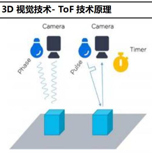 飞行时间(ToF):由发射和反射光信号之间的时间延迟来测量,给定固定的光速。为了精确地测量时延,经常使用短光脉冲。这种技术跟 3D 激光传感器原理基本类似,只不过 3D 激光传感器是逐点扫描,而 TOF 相机则是同时得到整幅图像的深度信息。特点:和结构光方式相比,ToF 并不需要对光的图案做复杂解析,只需要反射回来即可,这大大的提高了鲁棒性,深度信息还原度比结构光好很多,点云的完整性更好。主要表现在:深度图质量要高于结构光,抗强光的干扰能力也更强一些,精度也要更高一些。对于玻璃,是光技术的死穴,只能靠其他技术来弥补了。ToF 速度高,但精度只有毫米级。ToF 技术的难度较高,成本也较高。