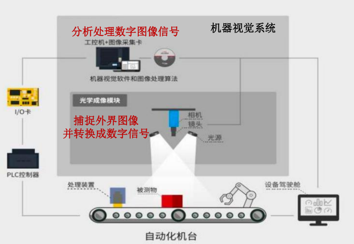 (3)控制单元:控制单元一般包含光电传感器、I/O、运动控制、电平转化单元等,用以判断被测对象的位置和状态,告知图像传感器进行正确的采集或根据图像处理结果完成对生产过程的控制;