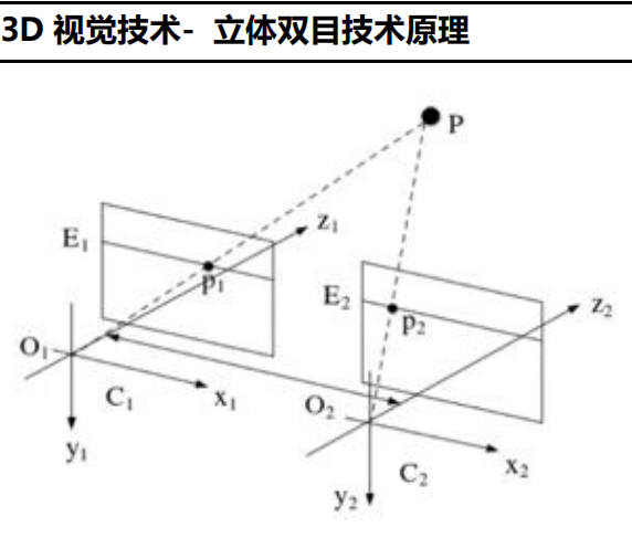 立体视觉法:指从不同的视点获取两幅或多幅图像重构目标物体 3D 结构或深度信息, 目前立体视觉 3D 可以通过单目、双目、多目实现。双目机器视觉是指使用两个 RGB 彩色相机采集图像,并通过后端的双目匹配和三角测量等算法,计算得到深度图的技术方法。双目技术使用的是物体本身的特征点,由于每一次双目匹配都面对不同的图像,都需要重新提取特征点,计算量非常大。双目是一种被动的三维测量技术。特点:硬件复杂度较低,弱光或目标特征不明显时几乎不可用。同时,双目相机的运算复杂度也非常高,对硬件计算性能要求极高。因为计算能力要求高,双目相机极少在嵌入式系统设备中使用,双目相机在通用场景中表现也并不太好,像诸如 slam 导航等应用,但在工业自动化领域和 x86 系统中,双目相机应用广泛,因为工业自动化中,双目相机只要解决特定场景中的特定问题。