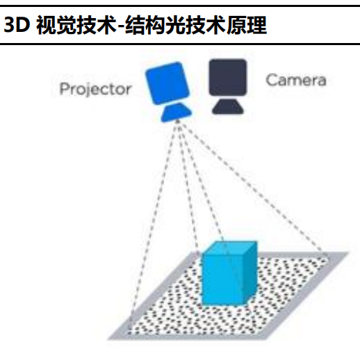 结构光:通过光学投射模块将具有编码信息的结构光投射到物体表面,在被测物表面形成光条图像。图像采集系统采集光条图像后,通过算法处理得出被测物表面的三维轮廓数据,以还原目标物体三维空间信息。结构光技术是一种主动的三维测量技术。特点:由于结构光是主动光,好处是昏暗环境和夜间可用。不需要根据场景的变化而有变化,降低了匹配的难度。但显然在强光环境中会受到干扰,室外基本不可用。另外,由于主动结构光是带编码的,所以多个结构光相机同时使用也是有问题的。在实测中,结构光在角度比较小的侧面上反射比较严重,经常出现比较大