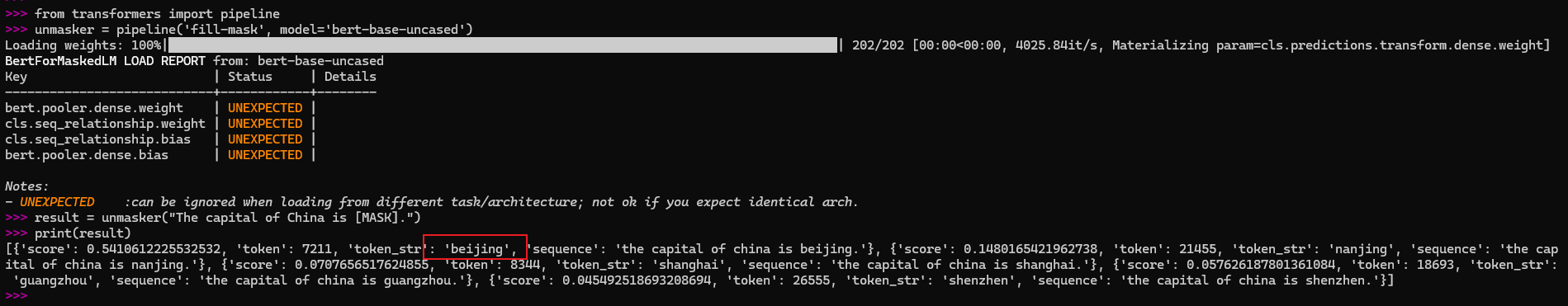 unmasker = pipeline('fill-mask', model='bert-base-chinese')