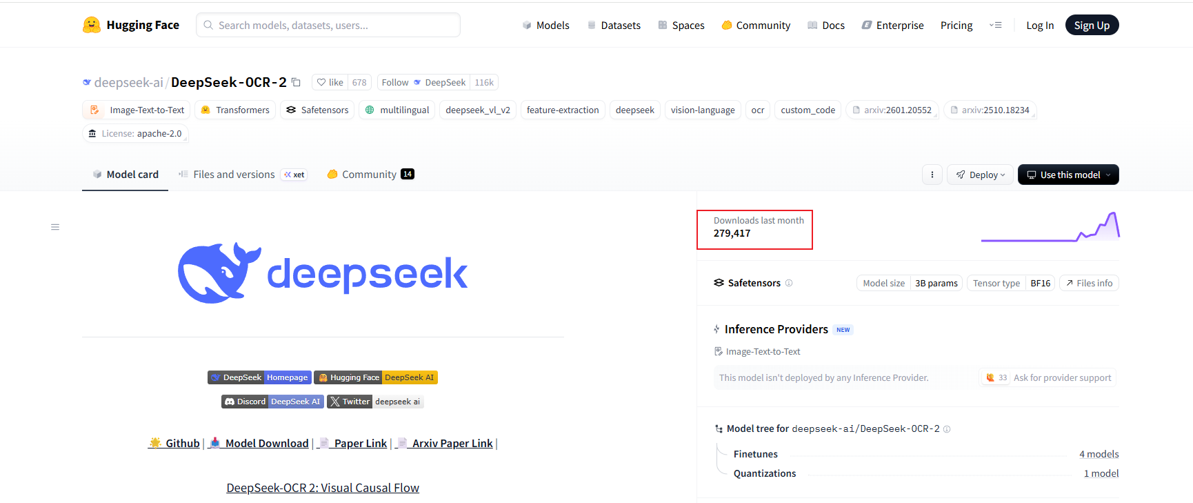 比如在以上Hugging face的界面给出了一堆大模型,就拿deepseek-ai/DeepSeek-OCR-2来说吧,我们点击去看: