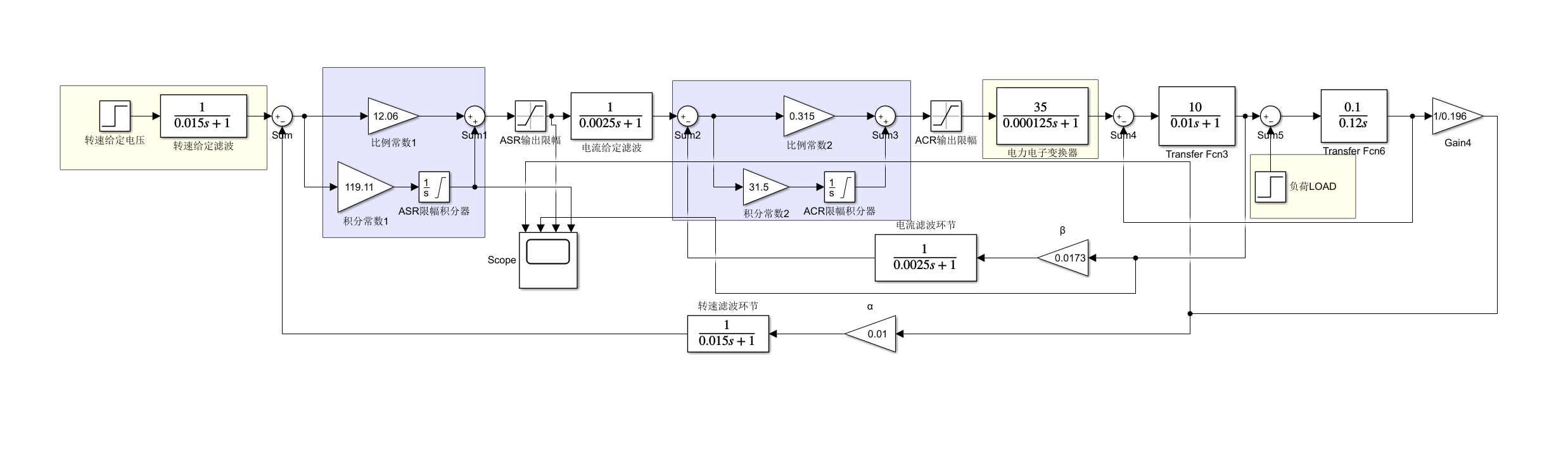 双闭环系统由转速外环与电流内环构成,其核心逻辑为:转速环通过PI调节器生成电流给定值,电流环据此调节电枢电压,形成"转速偏差→电流调节→转矩输出→转速修正"的闭环控制链。系统动态模型可表示为: