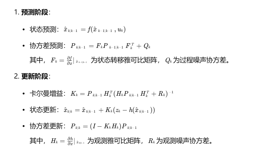 EKF通过一阶泰勒展开将非线性系统线性化,核心步骤如下: