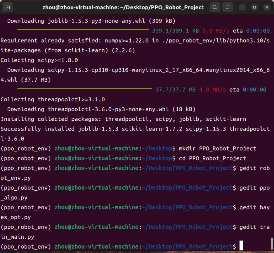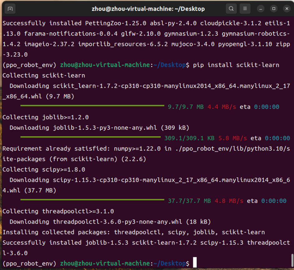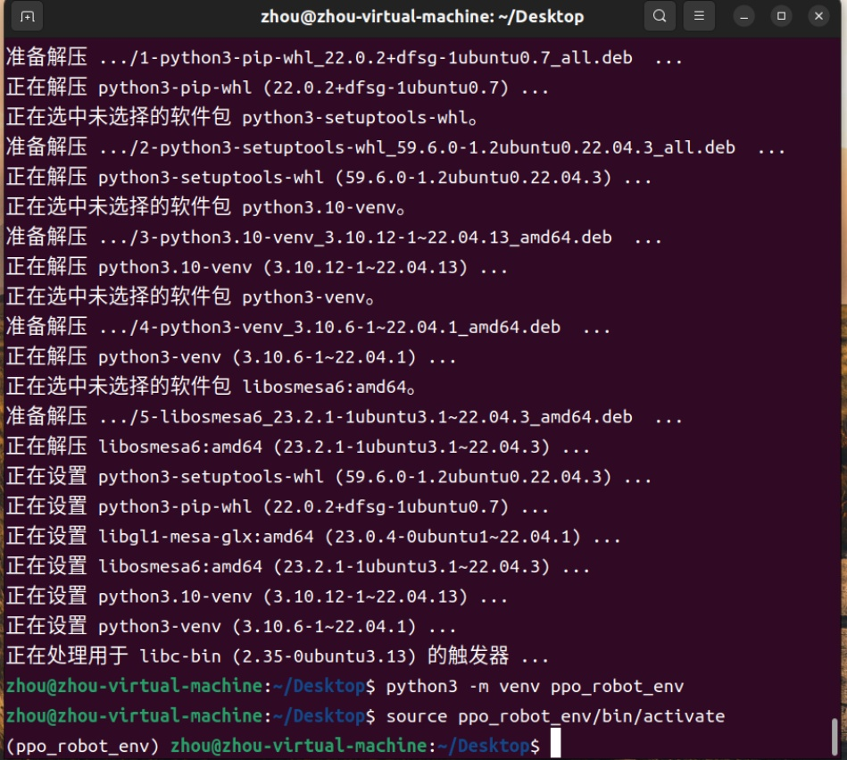 依次执行下列安装指令,时间稍微长一些,运行过程中会看到很多下载进度条,等所有命令跑完回到 (ppo_robot_env) 的提示符,即-回到命令行:要看到那行绿色的提示符 (ppo_robot_env) zhou@zhou-virtual-machine:~/Desktop$ 再次出现就算环境配置完成了,再接着运行下一条指令!