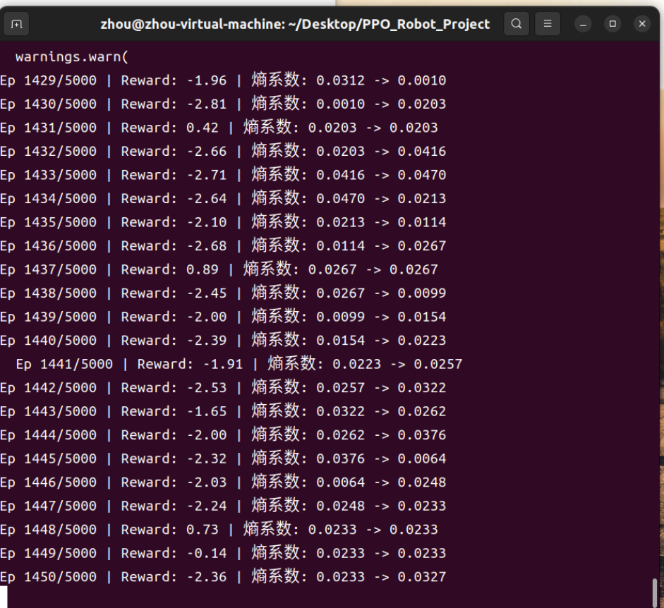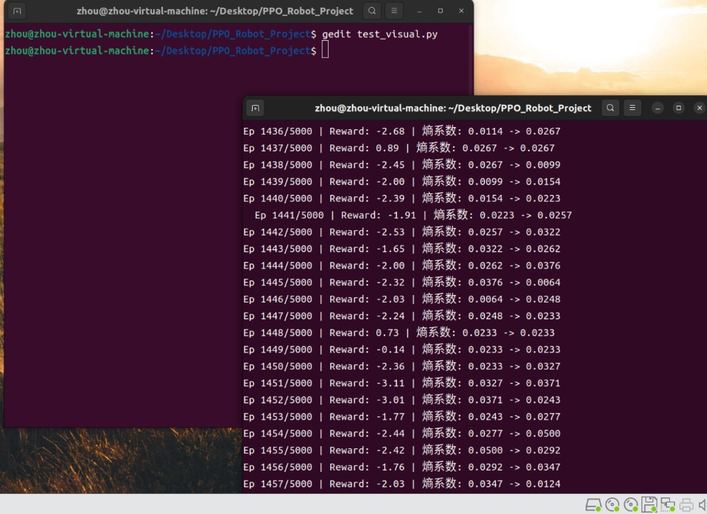 在虚拟环境下(ppo_robot_env),分别创建该4个python代码,所有文件创建好之后,在终端输入以下命令开始运行代码: