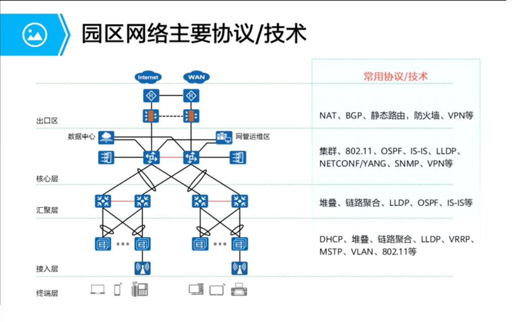 - 核心层: 负责整个园区网络的高速转发,实现不同业务网之间的互相访问和内外网的通讯。