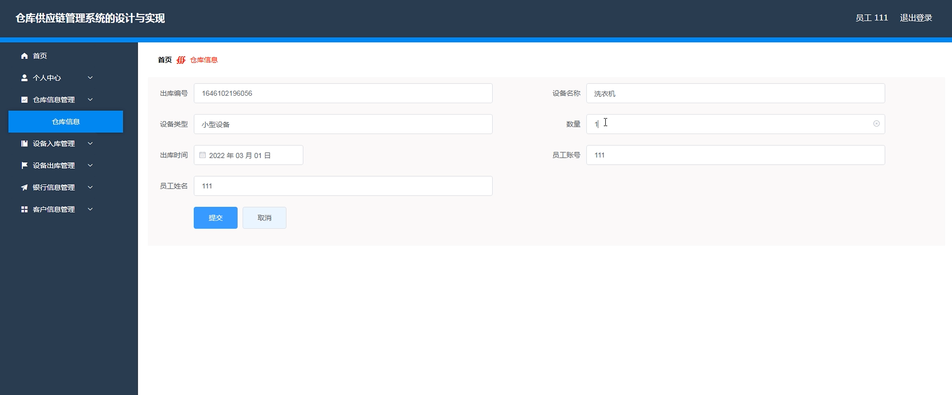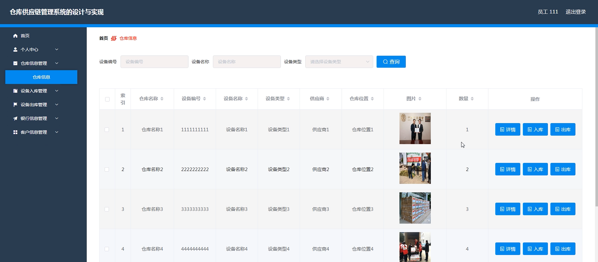 项目功能:员工,设备类型,仓库信息,设备入库,设备出库,供应商,客户信息,银行分类,银行信息