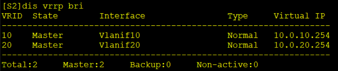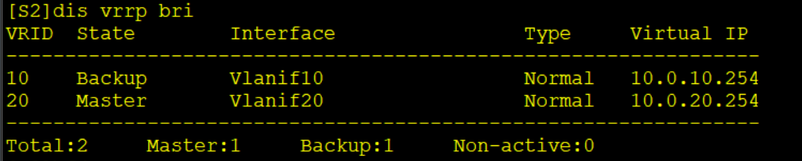 [S2-Vlanif20] vrrp vrid 20 virtual-ip 10.0.20.254