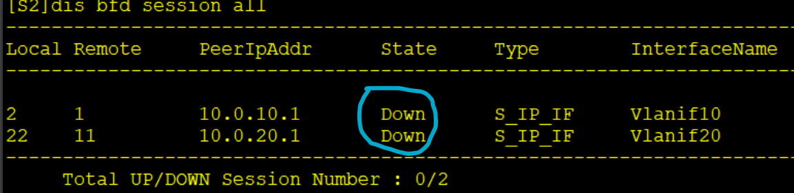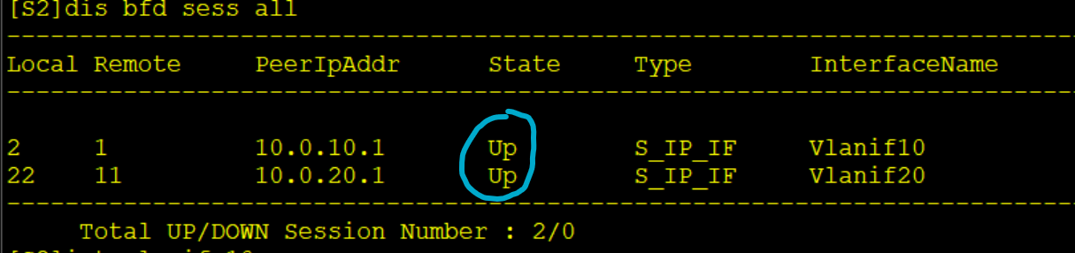 [S2]bfd vlanif20 bind peer-ip 10.0.20.1 interface Vlanif20