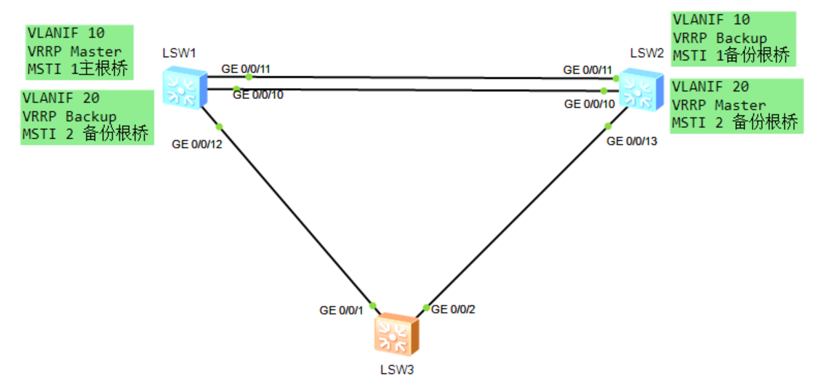 划为 MSTI1 的主根桥、MSTI2 的备份根桥,将 SW2 规划为 MSTI2 的主根桥、MSTI1 的备份