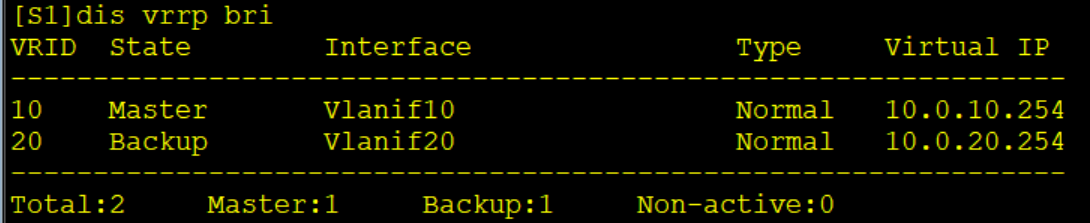 [S1-Vlanif20] vrrp vrid 20 virtual-ip 10.0.20.254