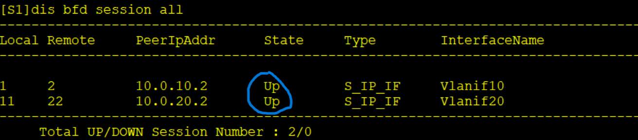 此时 S1、S2 上 BFD 会话状态都为 Up。