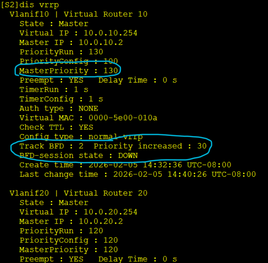 [S2-Vlanif10] vrrp vrid 10 track bfd-session 2 increased 30