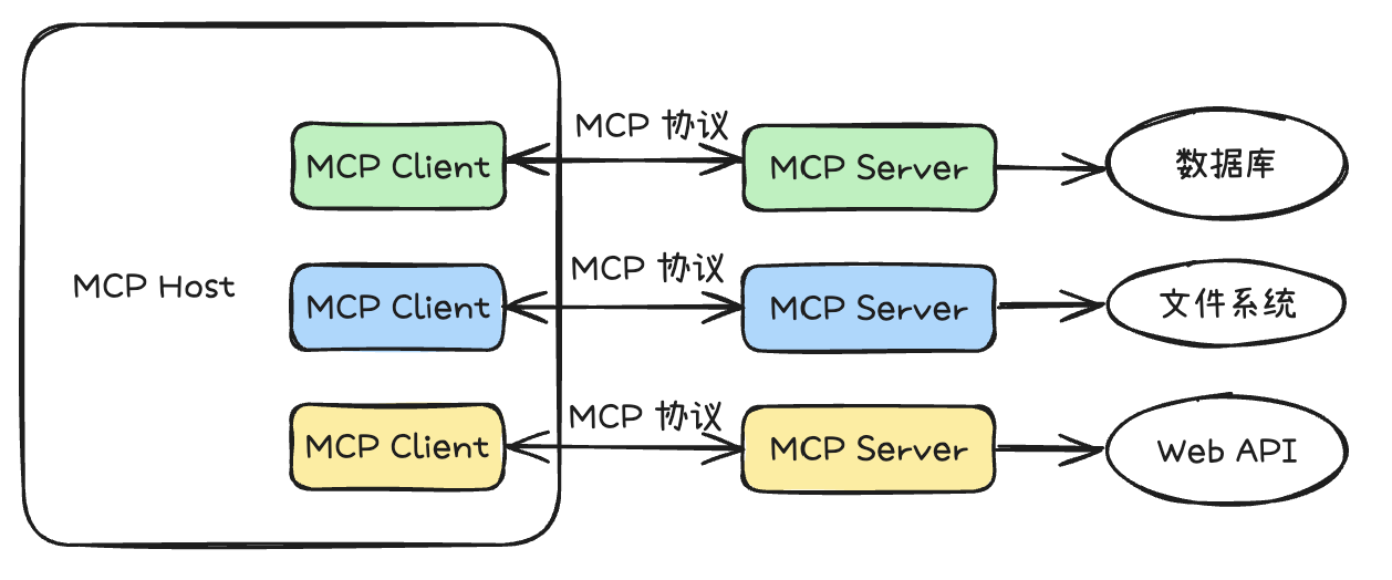 MCP主要采用 Client - Server 架构,其核心架构主要包括以下内容: