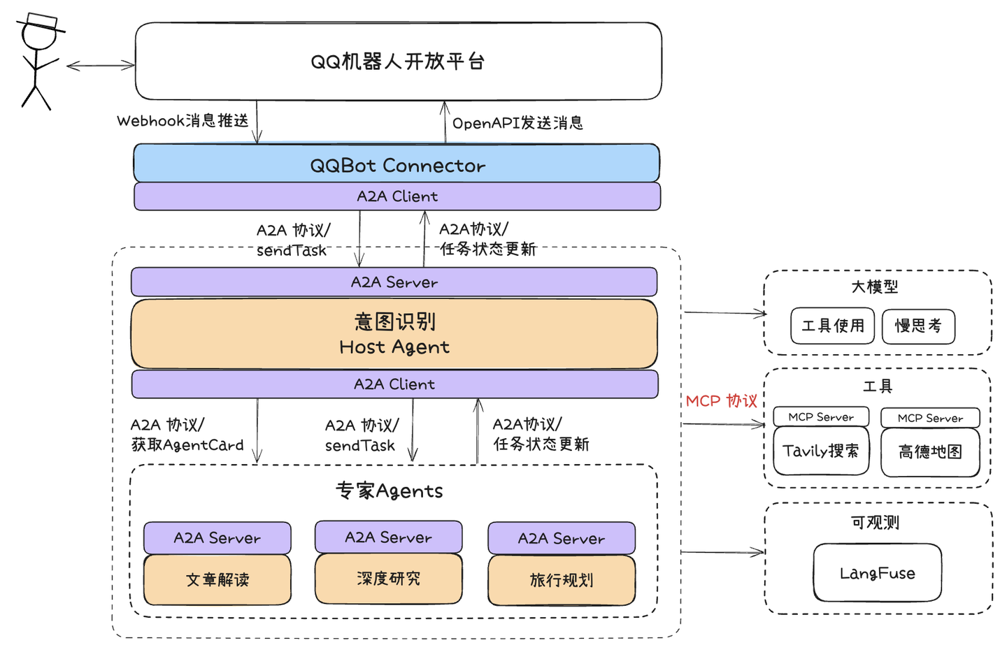 - 接收到消息后,使用A2A协议往Agent发送任务,流式接受任务执行结果状态更新。
