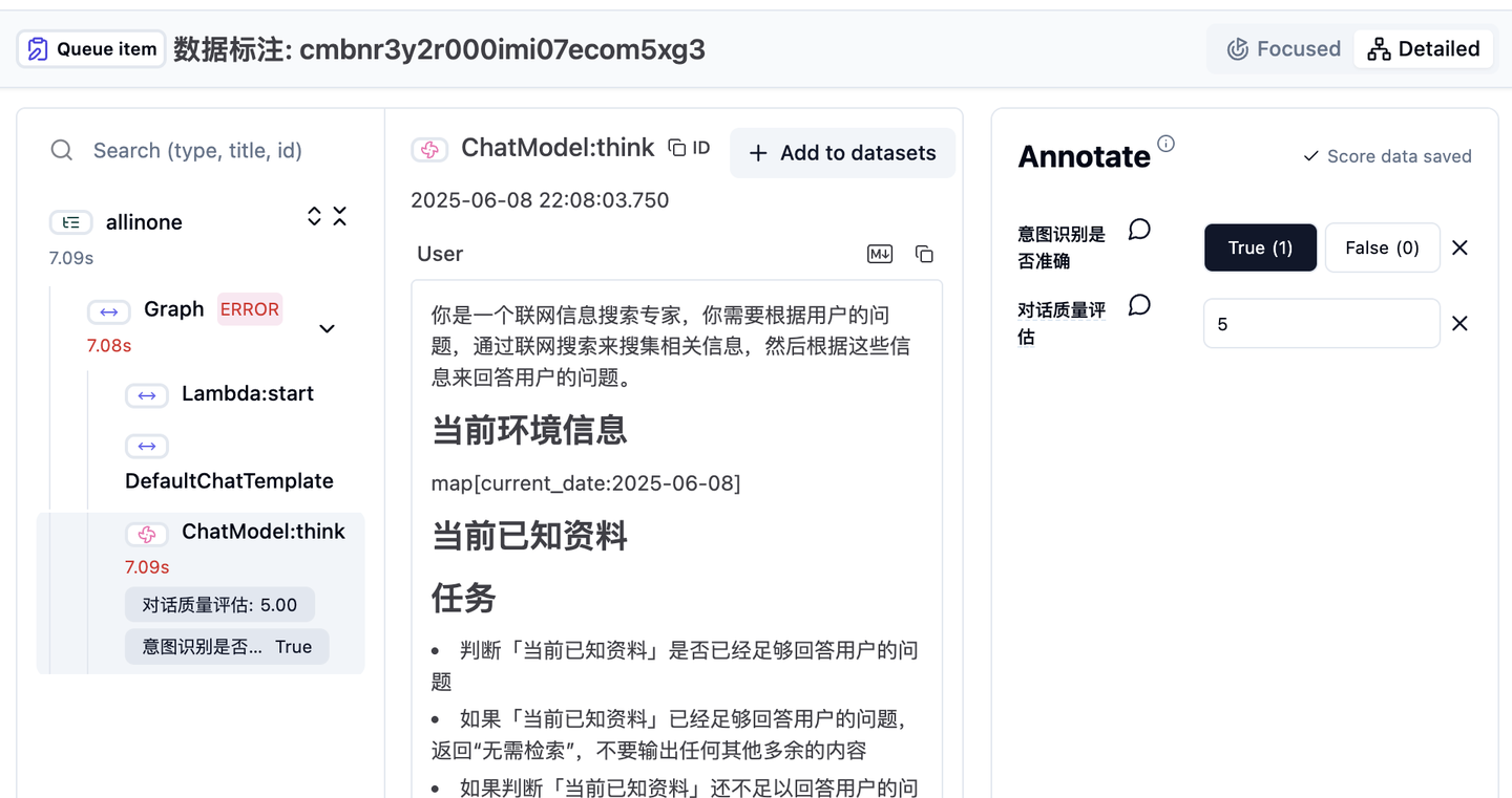 另外,Demo接入了Langfuse的可观测组件,不仅实现了Agent内部运行流程的全链路可观测,还提供了对数据进行标注、持续优化回复效果的能力。通过可观测和数据标注,开发者可以实时查看每个Agent的任务处理状态、性能指标、异常日志等信息,并基于标注数据不断优化系统表现,提升了系统的可维护性、问题定位效率和回复质量。
