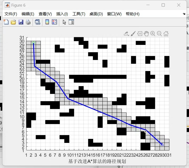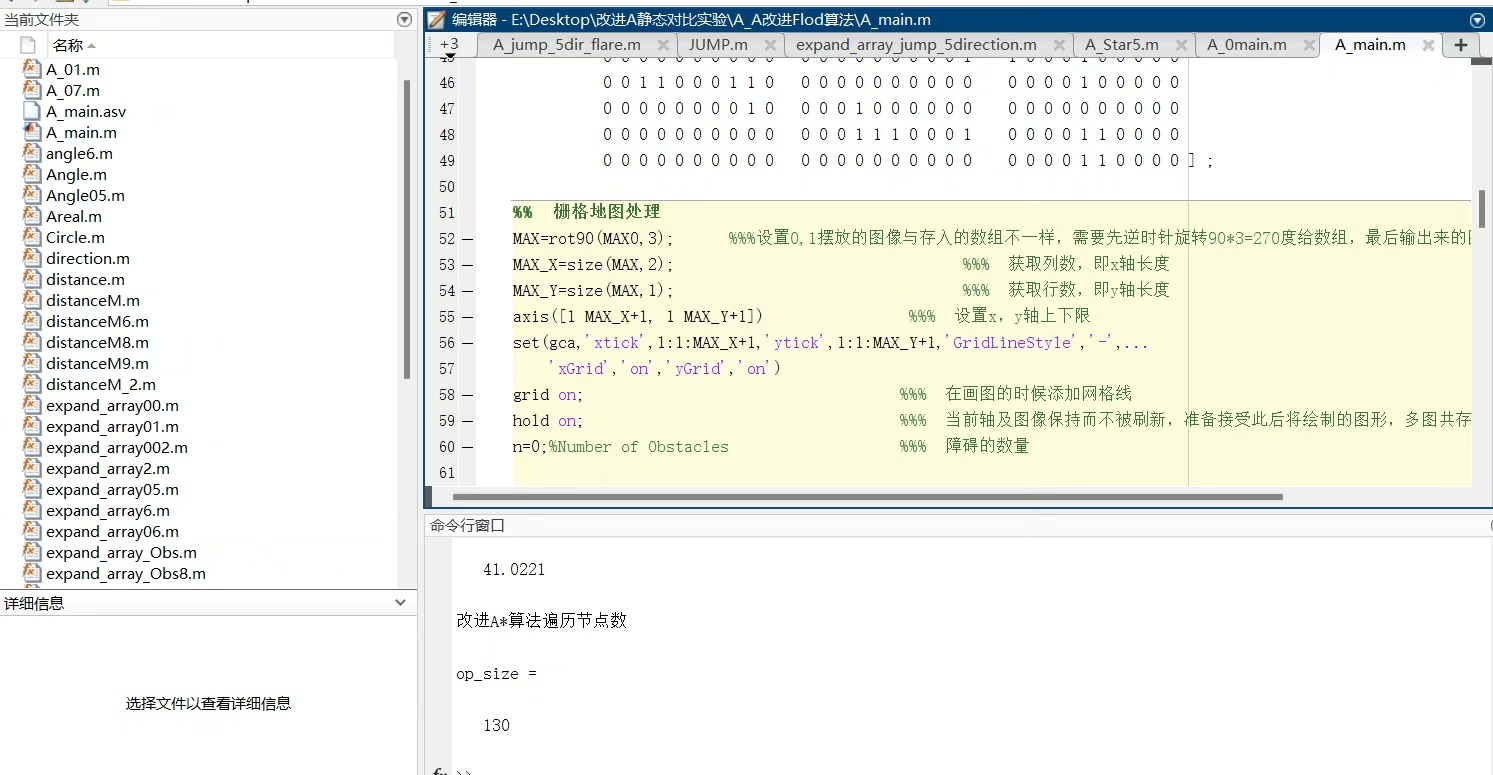 融合floyd算法的改进A星算法路径规划代码 可备注,可以,可依据需求更改地图 %% 改进A*算法 路径规划 % 改进A*算法 1 8个搜索方向变成 5个 提高搜索方向 % 2 无斜穿障碍物顶点 避免发生碰撞 % 3 基于改进floyd双向平滑度优化,删除中间多余节点,减少转折,增加路径的平滑度 % 4 评价函数:f(n)=g(n)+(1-log(P))*h(n) % P表示起始点与目标点之间的障碍率 % = 障碍物的数量/栅格总数 % 其中r为当前点到目标点的距离,R为起始点到目标点的距离。 % 试验对比如下