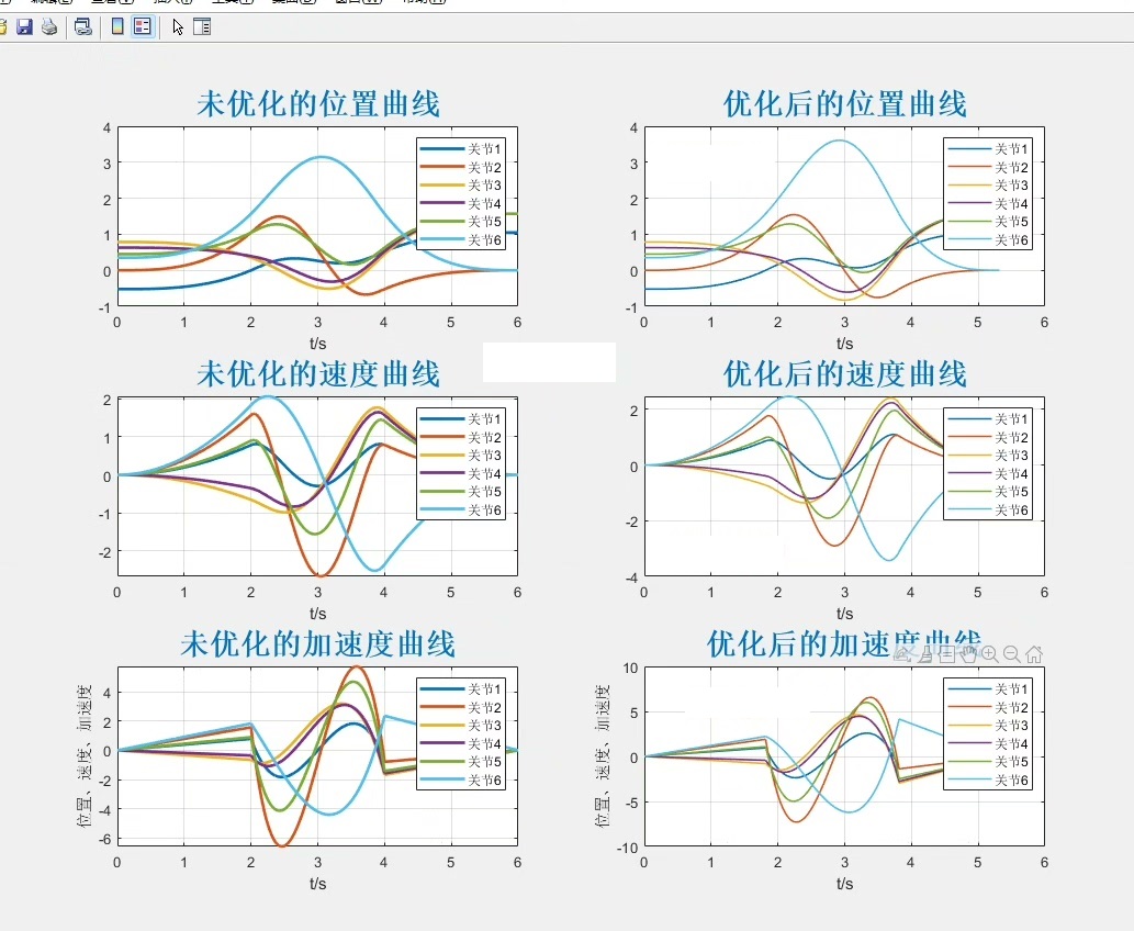这段代码实现了改进粒子群算法用于轨迹规划。通过不断迭代调整粒子的位置和速度,找到最优的轨迹参数,使机械臂能在满足速度和加速度约束的情况下,以最短时间到达目标位置。