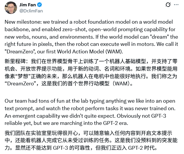 由于 DreamZero 是以视频为核心的世界模型,它学习的是物理世界的通用动态,而不仅仅是特定的电机指令。