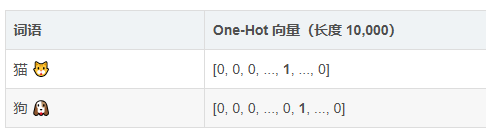 举例:词表中有 10,000 个词,每个词都用一个只有一个 1,其它全是 0 的向量来表示。