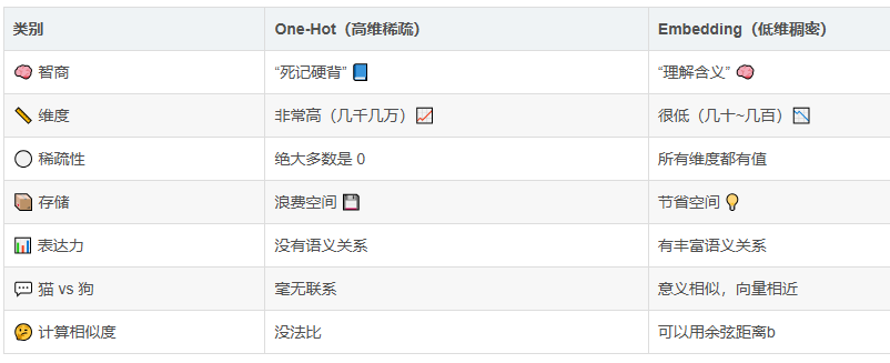 🧱 没有语义信息(“猫”和“狗”之间毫无关系)