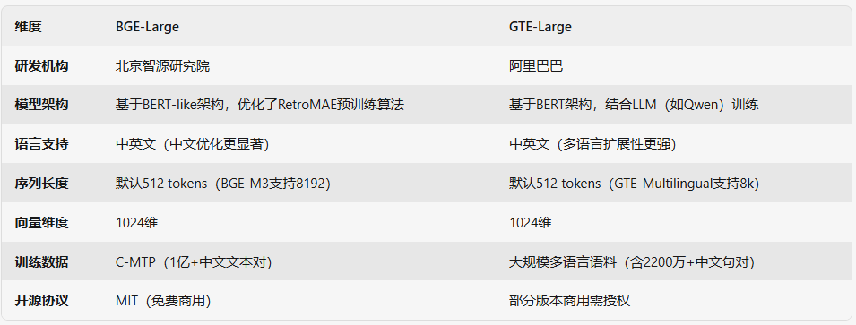 BGE-Large(智源研究院)和GTE-Large(阿里巴巴)(6月之前)是当前中文RAG领域主流的开源Embedding模型,两者的核心区别与优势如下: