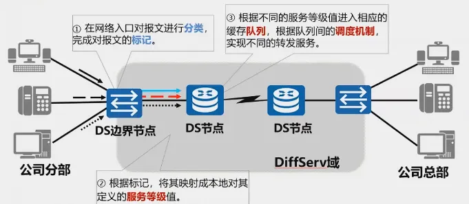 为解决综合服务模型的协议实现复杂性及带宽利用率低等问题,在网络中可部署DiffServ区分服务模型来保证关键业务的通信质量。