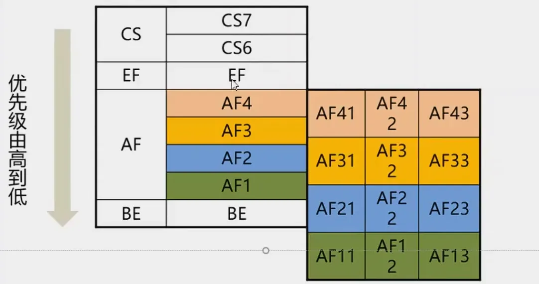 - AF确保转发服务:实现带宽保证的业务,AFxy,x代表优先级,越大优先级越高,y代表丢弃率,越大丢弃率越高。适合TCP类业务,或者对丢包不敏感的业务