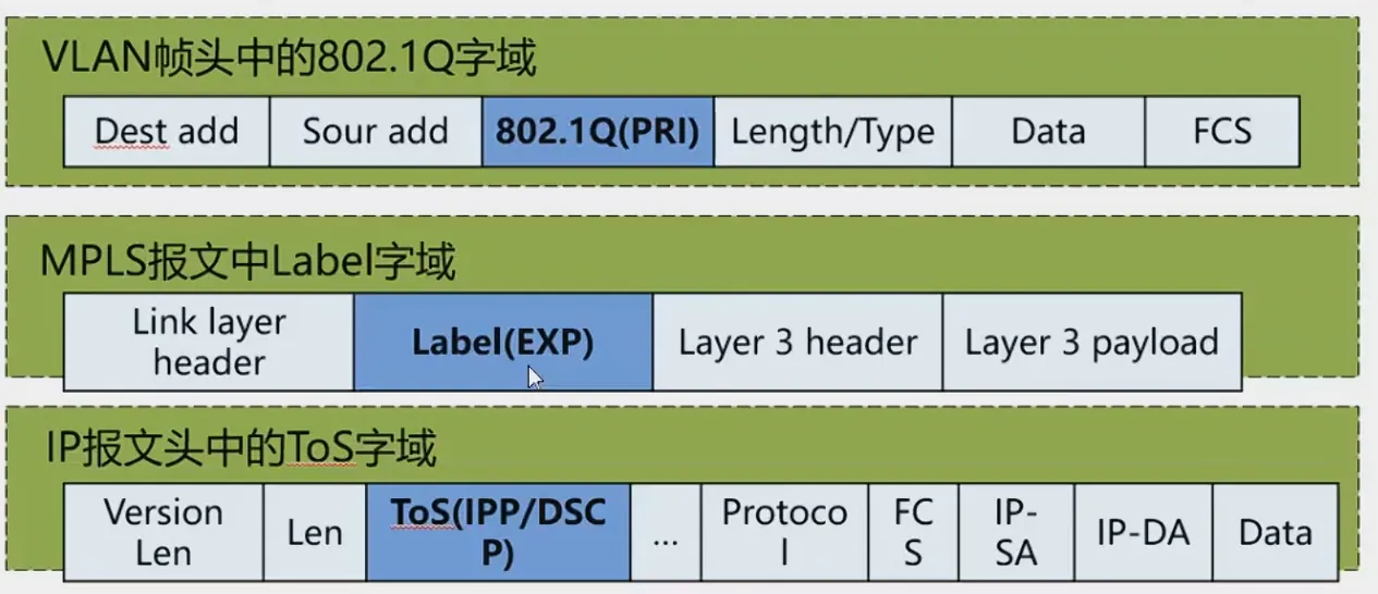- 端到端进行QoS部署时,如果需要每台设备都对报文进行分类,那么就会导致耗费大量地设备处理资源,为此提出了对报文进行标记的方法