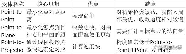 下表总结了ICP算法的主要变体及其特点: