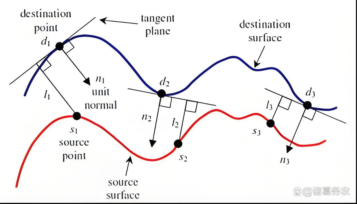 Point-to-Plane ICP:不是最小化点到点的距离,而是最小化点到目标点切平面的距离。这通常能更快、更精确地收敛,尤其对曲面物体。
