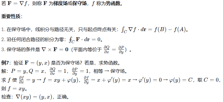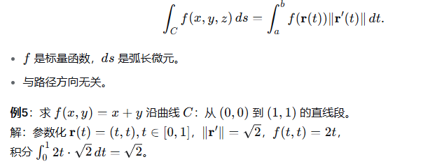 线积分有两种:对标量场的积分(求曲线质量、弧长)和对向量场的积分(求功、环量)。