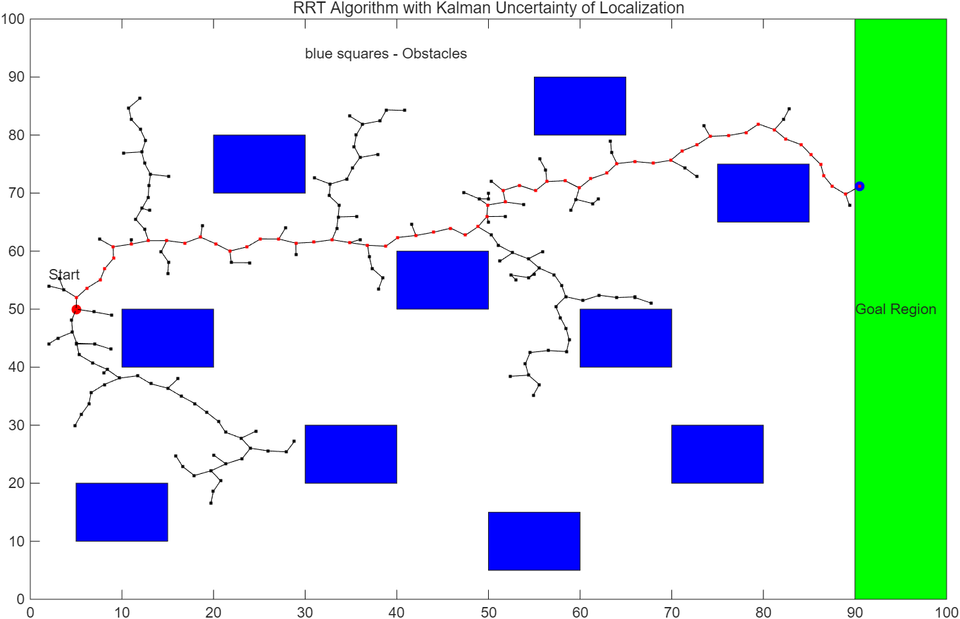 【机器人】基于RRT算法进行移动机器人的路径规划,并在路径上应用卡尔曼定位不确定性附matlab代码