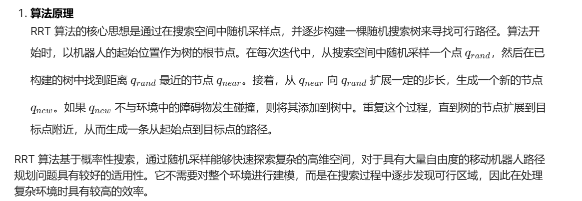 局限性:RRT 算法生成的路径通常不是最优路径,因为它是基于随机采样的搜索过程,可能错过一些更优的路径选择。此外,RRT 算法对环境变化的适应性有限,当环境中的障碍物发生动态变化时,可能需要重新进行路径规划。