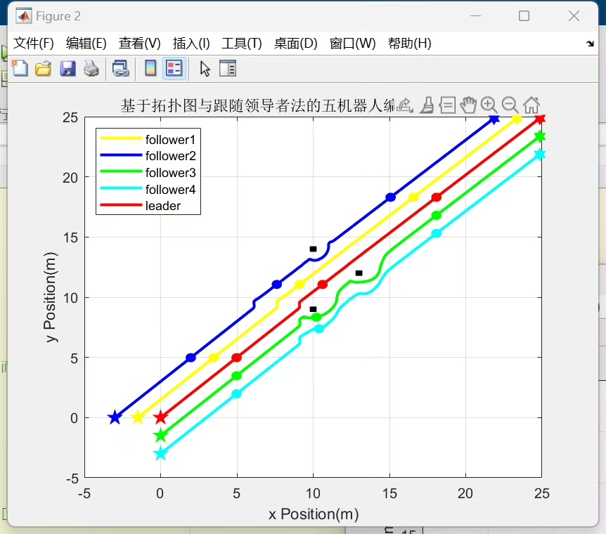cal_mse.m计算跟随者与理想位置的偏差,稳定后误差应<0.1m,说明编队精度达标; - 避障效果:机器人运动轨迹应绕开障碍物,无碰撞发生,且避障后能快速恢复编队队形;