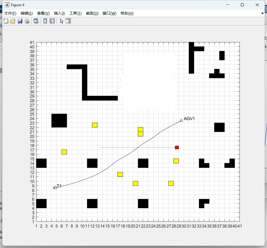 - 可视化渲染引擎:通过MATLAB图形系统实现地图的实时可视化,不同地图元素采用差异化渲染策略——障碍物以实心黑色方块标示,AGV起点使用蓝色三角标记,目标点采用绿色圆圈,移动障碍物路径则用红色虚线显示。